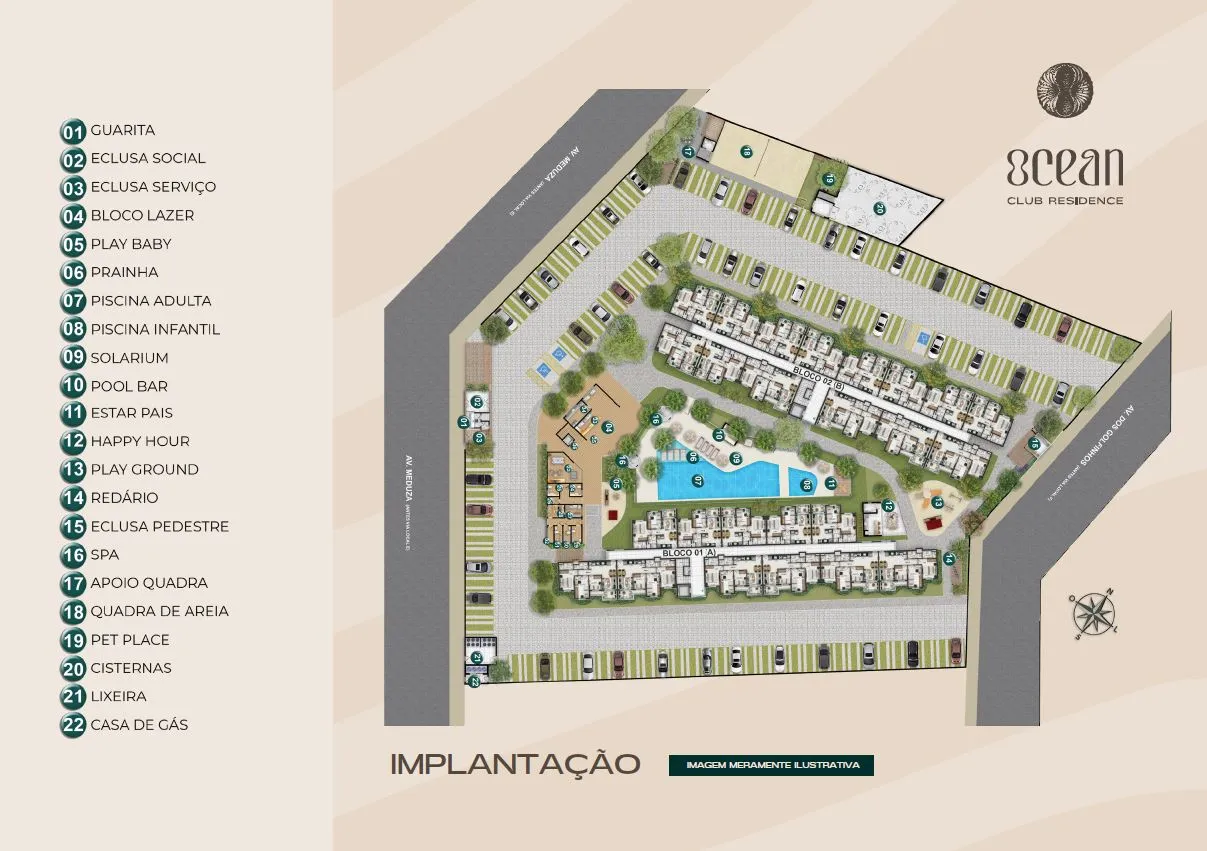 Ocean Club Residence é um empreendimento considerado um verdadeiro refúgio próximo à beira-mar. Localizado em Aquiraz  no Porto das Dunas, a apenas 600m do Beach Park, do mar, gastronomia e serviços a poucos passos de casa. Com área de terreno de 7.128,50m²  distribuídos em 2 torres com 125 apartamentos (térreo + 4 andares: sendo 11 unidades no bloco 1 e 14 unidades no bloco 2) um elevador por torre e áreas privativas que variam entre 42m² e 55m² com opção de 01 quarto c/ suíte e gabinete e 03 quartos c/ suíte com 1 vaga de garagem por unidade e 3 vagas de garagem acessíveis de uso comum. Além  de um área de lazer completa com quadra de areia, apoio quadra, pet place, portaria, acesso a praia, spa, piscina adulto com prainha, piscina infantil, solarium, pool bar, play baby, espaço happy hour, playground, redário, área para restaurante, sala de jogos, academia, salão de eventos, bar e muito mais.