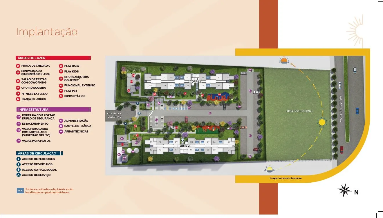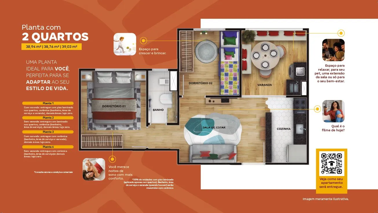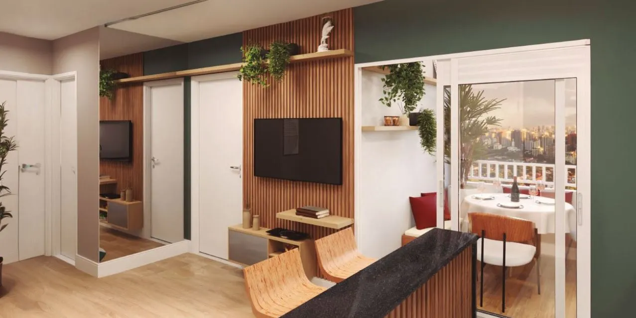 Todas as imagens, perspectivas e representações visuais contidas neste material possuem caráter meramente ilustrativo e têm como objetivo apresentar sugestões de decoração e ambientação do empreendimento. Podem ocorrer alterações nas características finais em decorrência de ajustes técnicos, legais ou executivos. As perspectivas artísticas da vegetação representam projeções de paisagismo com porte adulto, que será alcançado após a entrega do empreendimento e em conformidade com o projeto aprovado. O detalhamento completo dos serviços, acabamentos, equipamentos, e especificações técnicas que compõem este empreendimento encontra-se disponível no Memorial Descritivo, na Convenção de Condomínio e na Planta de Contrato, em conformidade com os termos da Lei nº 4.591/64.