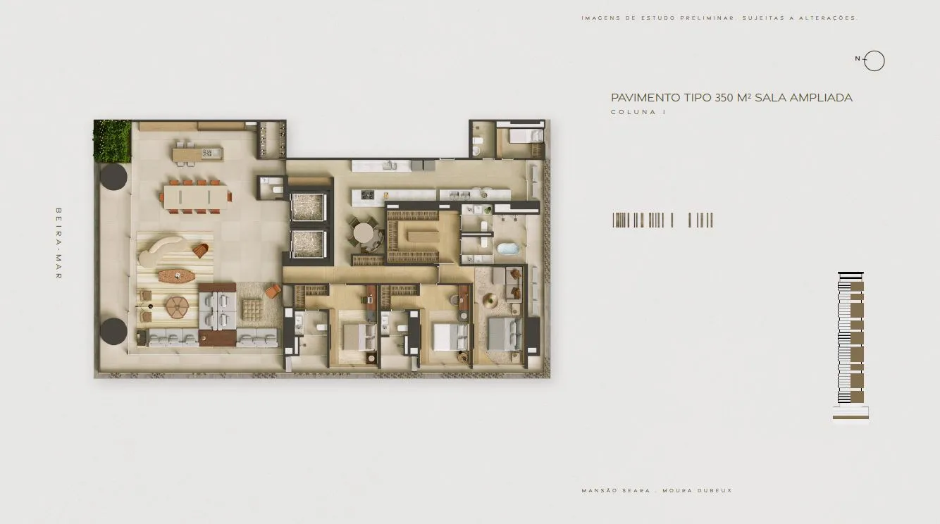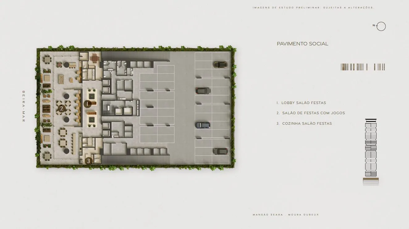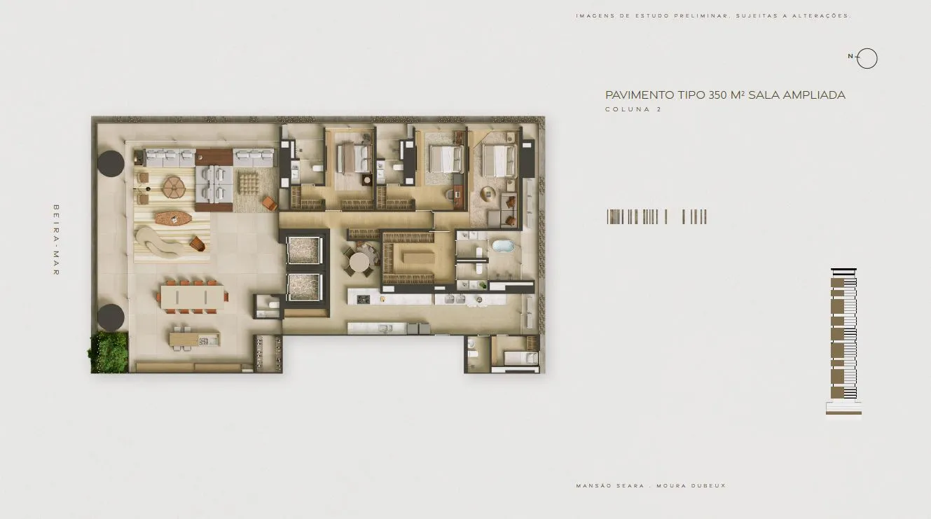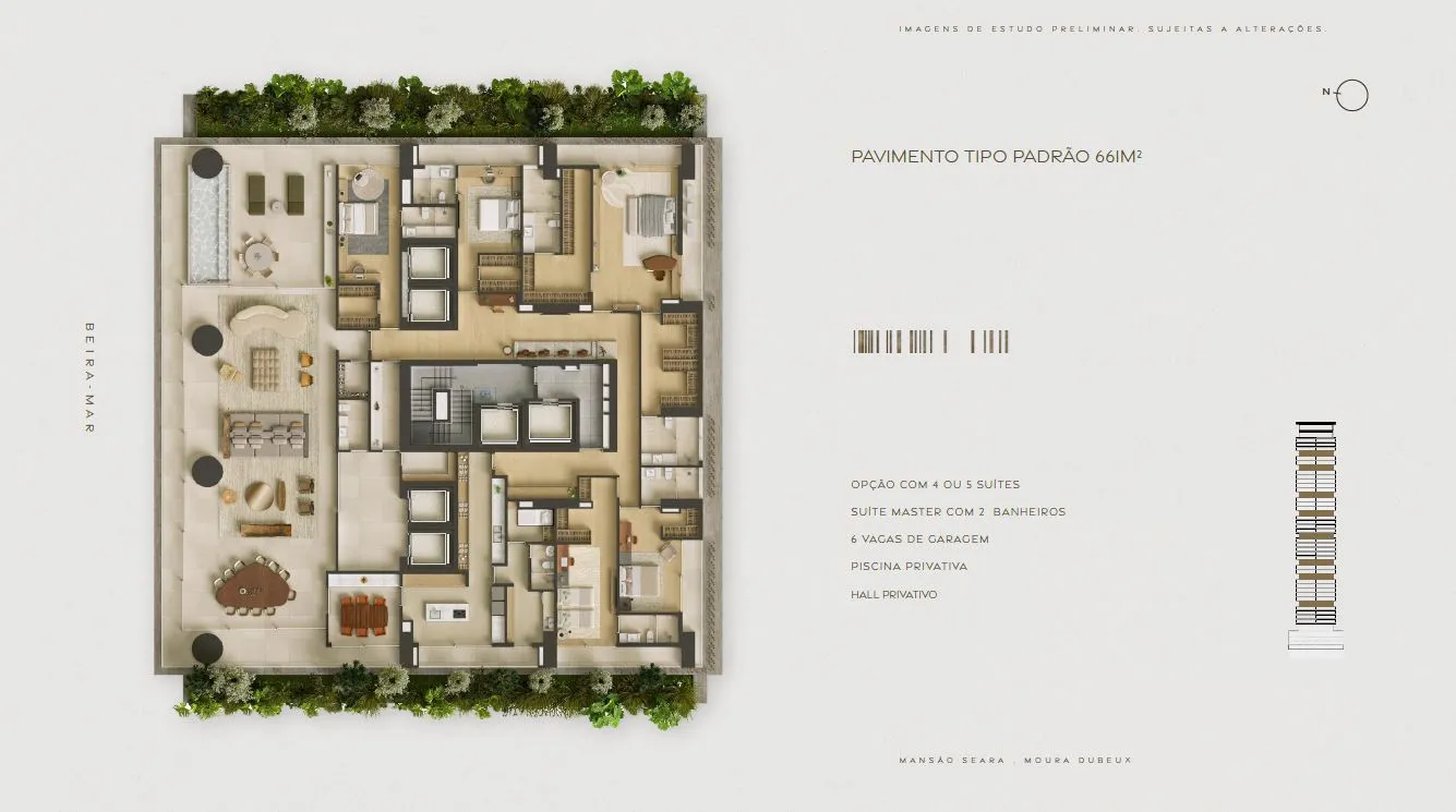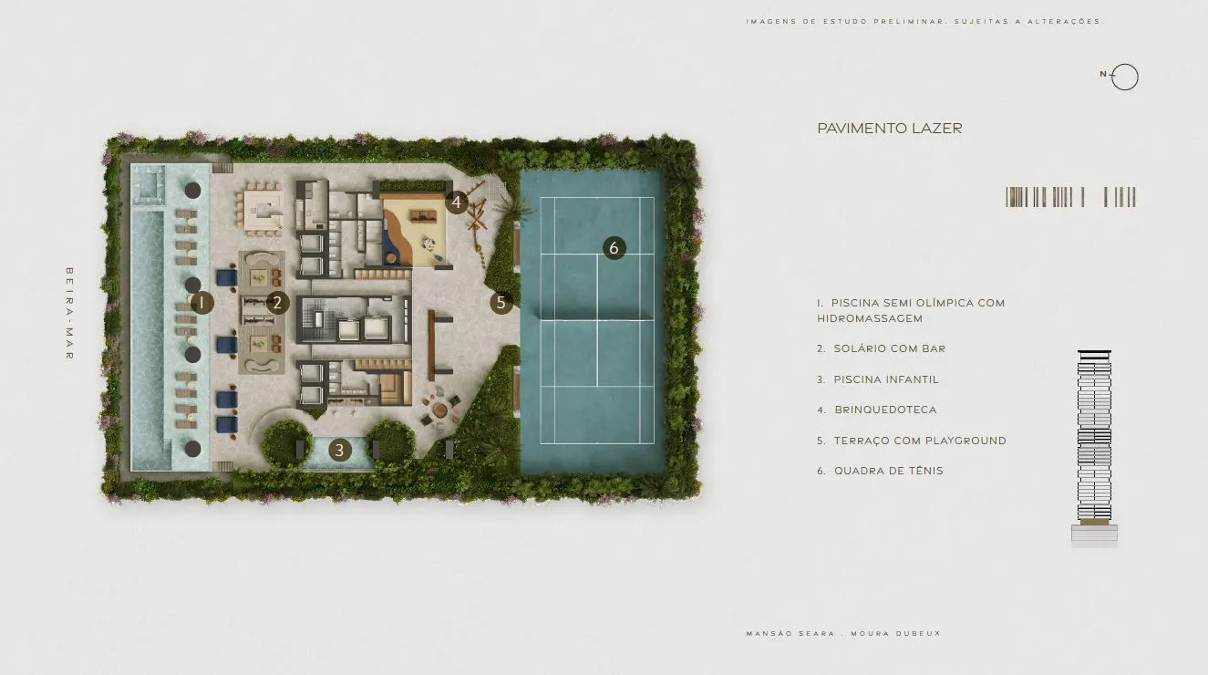 Mansão Seara é um empreendimento que é o primeiro projeto imobiliário verticalizado do premiado arquiteto Arthur Casas no Nordeste. Serão unidades de 350 m² e 661 m², sendo 4 ou 5 suítes, além de 4 ou 6 vagas de garagem. Localizado no Meireles, na Av. Beira Mar, ficando à 14min da Praia do Futuro, à 18min do aeroporto e ficando próximo a shoppings com Riomar Papicu e Iguatemi Bosque. Com área de terreno de 2.670,00m² distribuídos em subsolo 2, subsolo 1, térreo, garagem 1, garagem 2, pavimento social, 42 pavimentos tipo, rooftop, pavimento técnico e heliponto e área privativa que variam entre 350m² e 661m² com opção de 4 e 6 vagas vagas de garagem. Além de uma excelente área de lazer com sala de espera, sauna, academia, sala de ioga e pilates, área de relaxamento, salas de massagem, spa, piscina semi olímpica com hidromassagem, solário com bar, piscina infantil, brinquedoteca, terraço com playground, quadra de tênis, lobby salão de festas, salão de festas com jogos, cozinha salão de festas e mais.