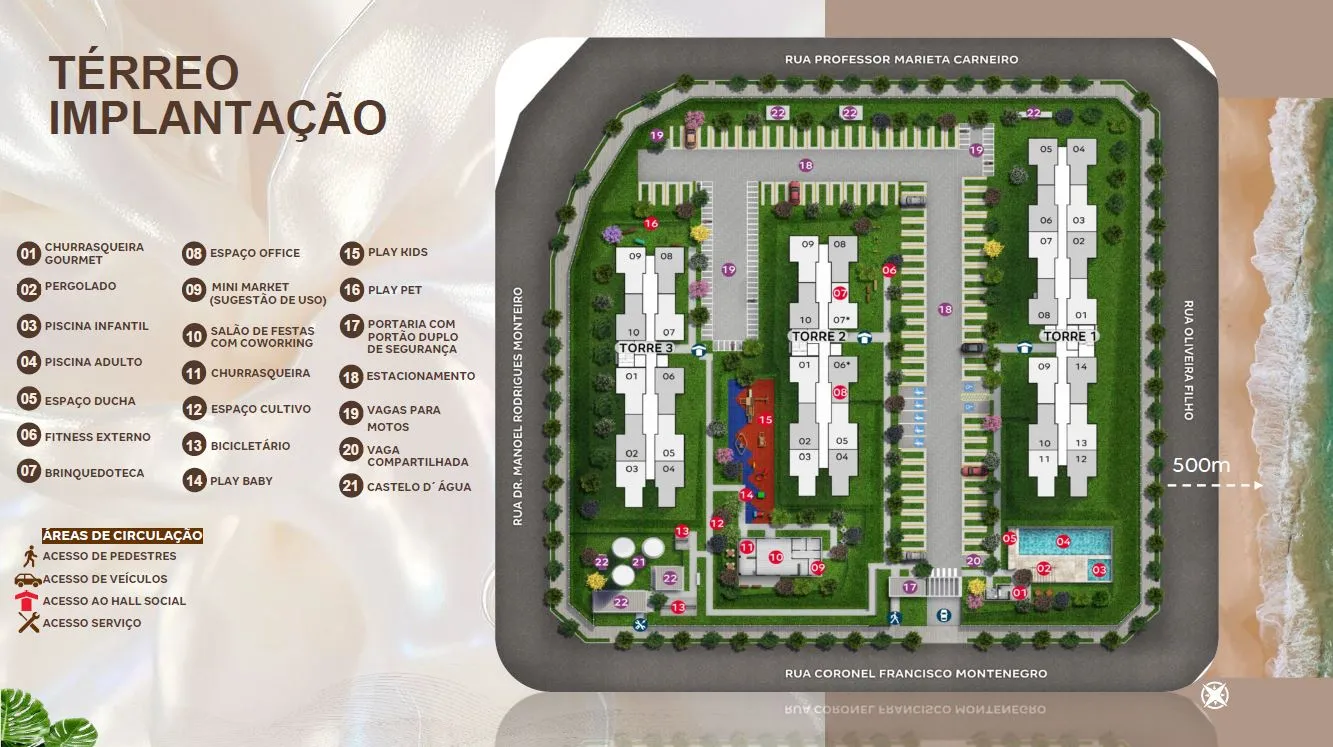 Vista Di Mar Prime é um empreendimento enquadrado no Programa Minha Casa Minha Vida. Localizado em um endereço cheio de facilidades, na Praia do Futuro, próximo ao Vila Galé, Chico do Caranguejo, da Av. Santos Dumont. UniFanor, Hospital São Matheus e Shopping Riomar Papicu. Com área de terreno de 9.81010m² com três torres (térreo + 14) com 508 unidades com 2 quartos com área privativas que variam entre 38,37m² à 38,73m². Além de uma excelente área de lazer com churrasqueira gourmet, pergolado, piscina adulto e infantil, espaço ducha, fitness externo, brinquedoteca, espaço office, mini market, salão de festas com coworking, churrasqueira gourmet, pergolado, espaço cultivo, bicicletário, play baby, play kids, play pet, castelo d’agua e conta com portaria com portão duplo de segurança, guarita e estacionamento.